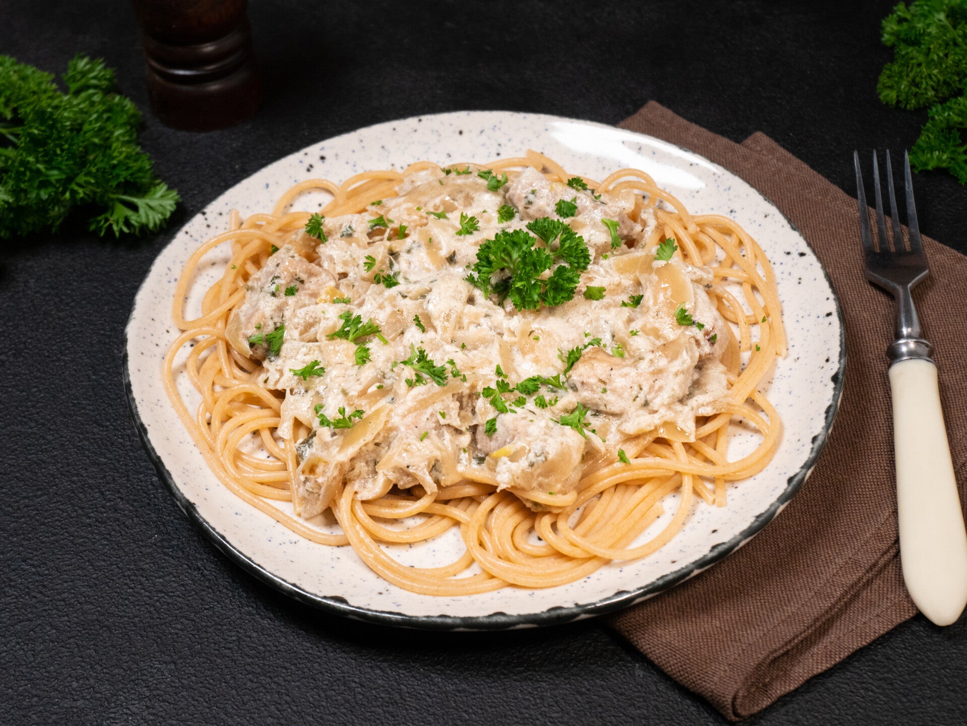 Sipuli (39 %), porsaan filee (34 %), smetana (19 %), auringonkukkaöljy, tuore yrtti, tärkkelys, ruokasuola, mustapippuri jauhettu.
